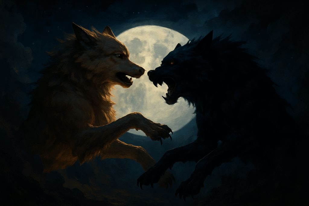 There are two great wolves fighting in the night sky. One good, the other evil.